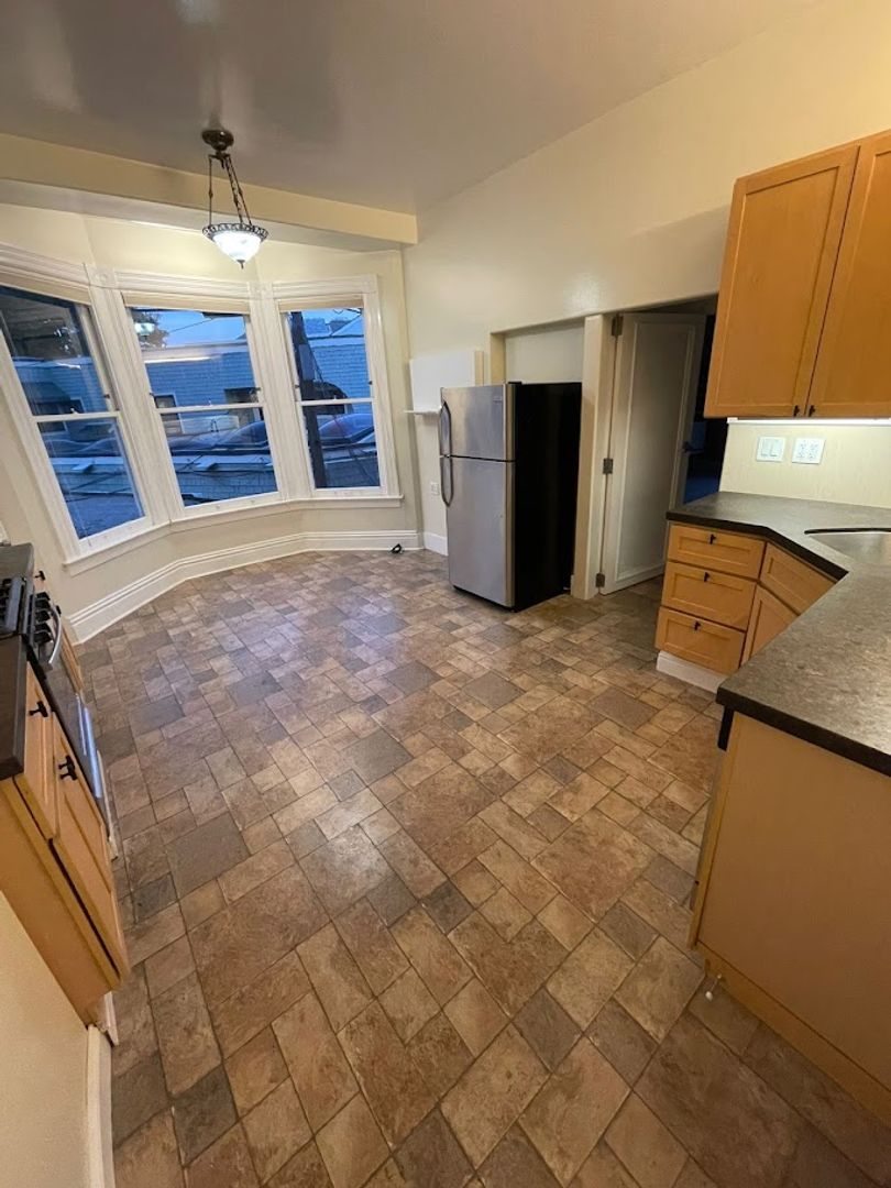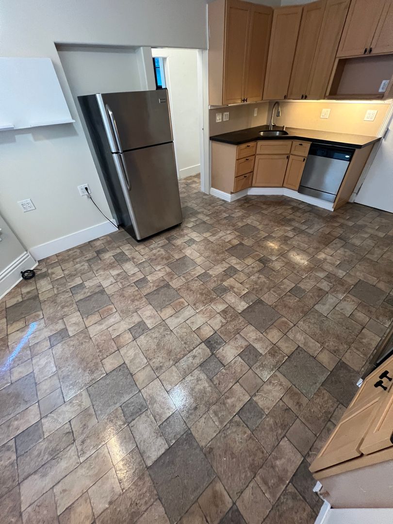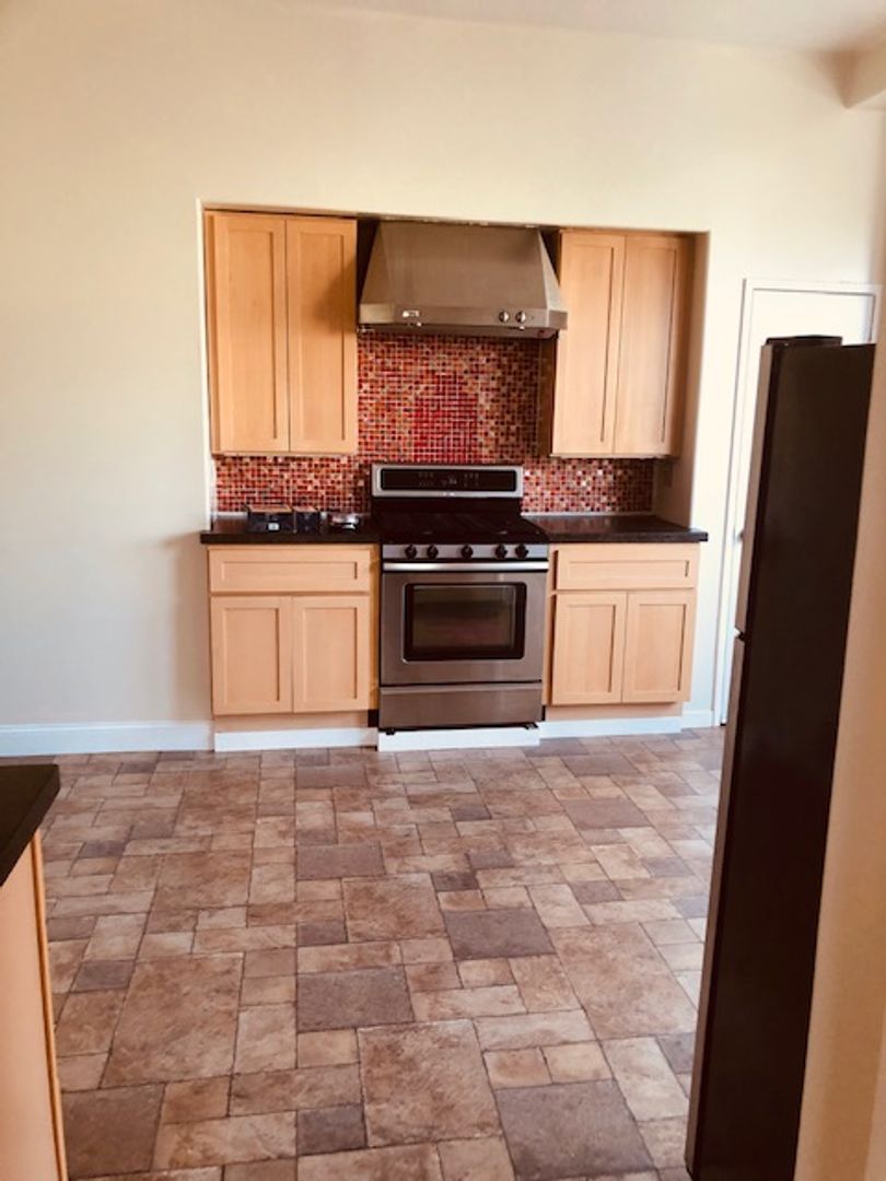The well-appointed kitchen features modern appliances including a range/oven, refrigerator, and dishwasher.